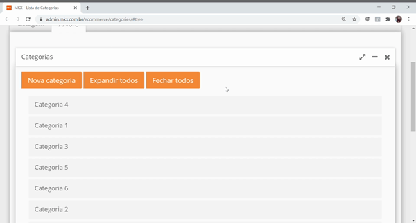 Para organizar as categorias, tanto em ordem que será exibida em seu site quanto a criação de subcategorias, realiza-se através da Árvore de categorias, localizado em uma aba na Listagem, como destacado abaixo: