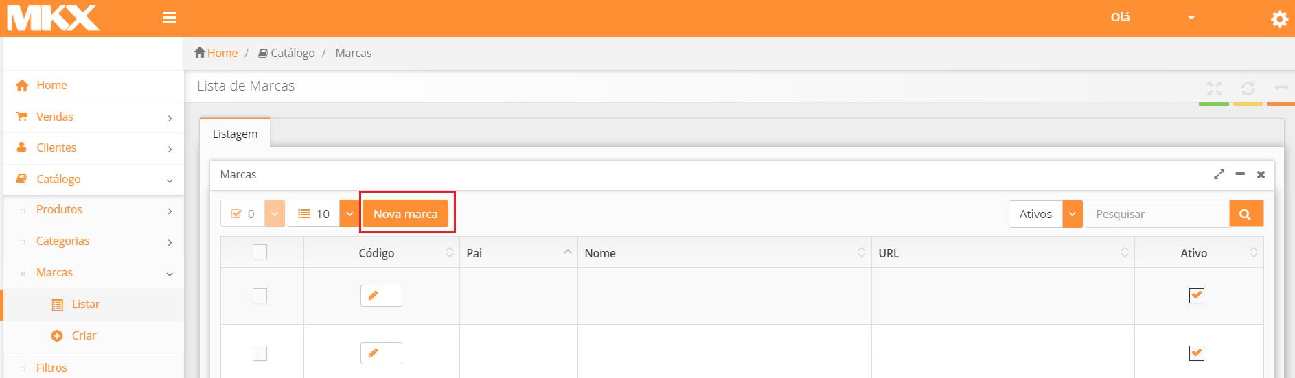 Ao abrir a Lista de Marcas você irá encontrar o botão “Nova Marca”