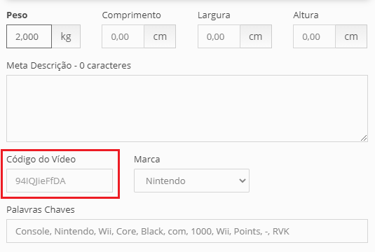 Uma vez copiado, basta inseri-lo no campo “Código do Vídeo” na primeira tela de informações do cadastro do produto.