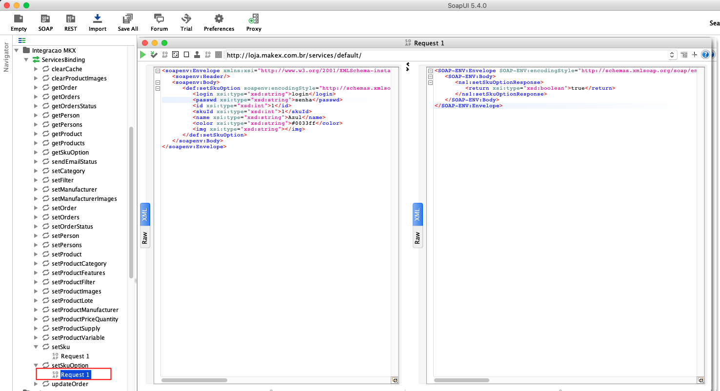 No exemplo abaixo, usamos o mesmo método: setProduct para alterar o estoque da cor: Azul para: 5, do produto: COD_TESTE, para isso informamos o código: COD_TESTE_AZUL no parâmetro: productCode, os parâmetros não informados não são alterados, todos opicionais.