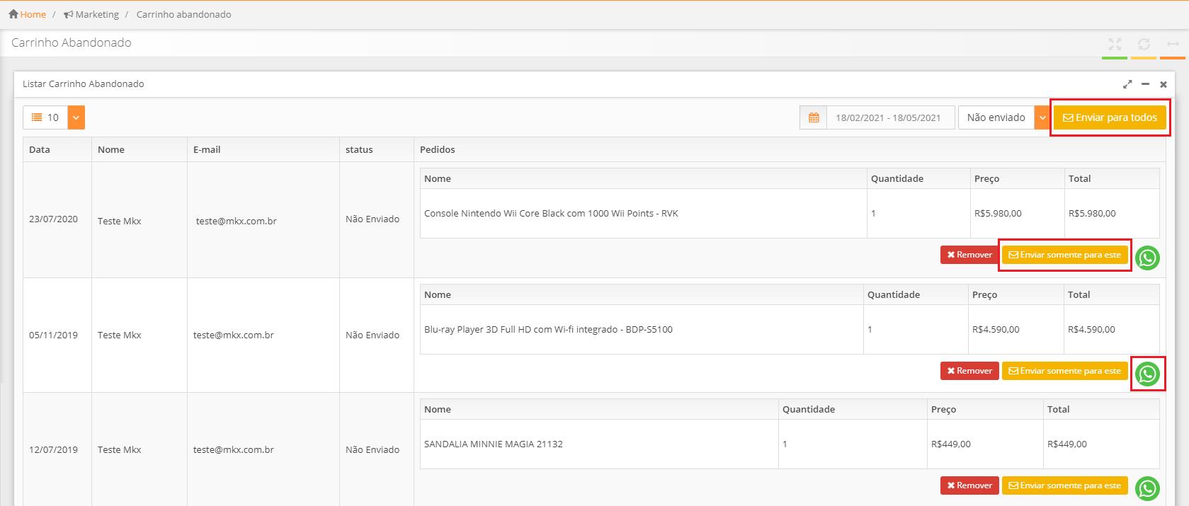 É possível realizar o disparo de e-mail para todos os carrinhos abandonados selecionando o botão “Enviar para todos” - ou entrar em contato individualmente em “Enviar somente para este”.