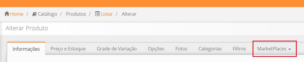 Você deve se direcionar ao cadastro do produto e, na última aba, encontrar a opção "Marketplaces". Conforme imagem abaixo. Clicando nela irá aparecer as opções de todos os Marketplaces, selecione então a opção Skyhub.