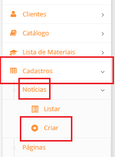 Uma vez ativado o recurso de blog/módulo de notícias, para inserir um novo conteúdo basta acessar o seu ADMIN e, no menu, ir até “Cadastros > Notícias > Criar”